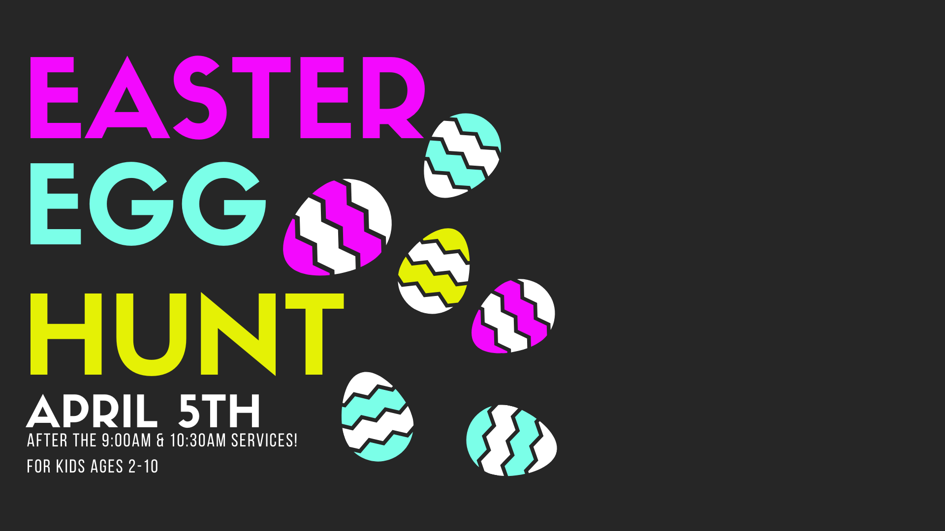 Join us on April 5th for one of two egg hunts: the first will take place around 10:15am (after the 9:00am service), and the second around 11:45am (after the 10:30am service).